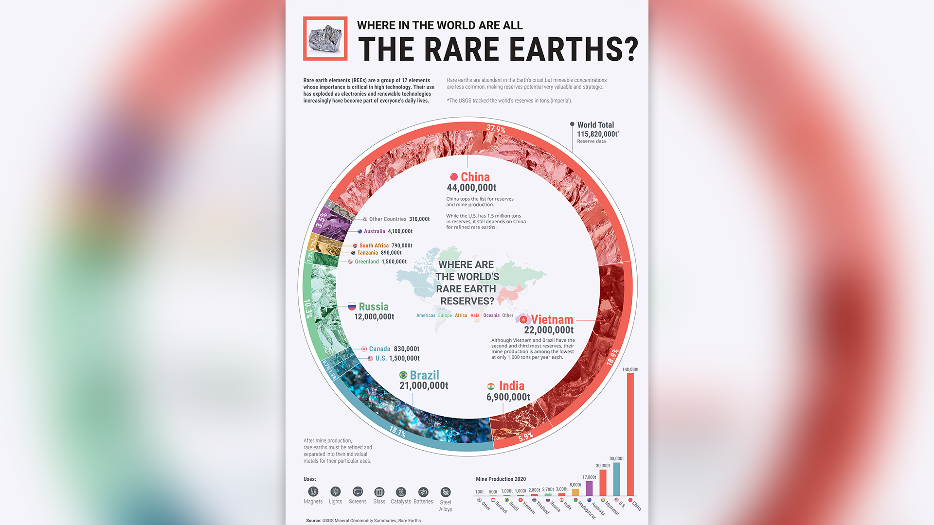 Vietnam y Brasil son casos opuestos al de China: poseen la segunda y tercera mayores reservas de tierras raras, con un 19 y un 18 %, respectivamente; y, sin embargo, sus volúmenes de producción son muy modestos.